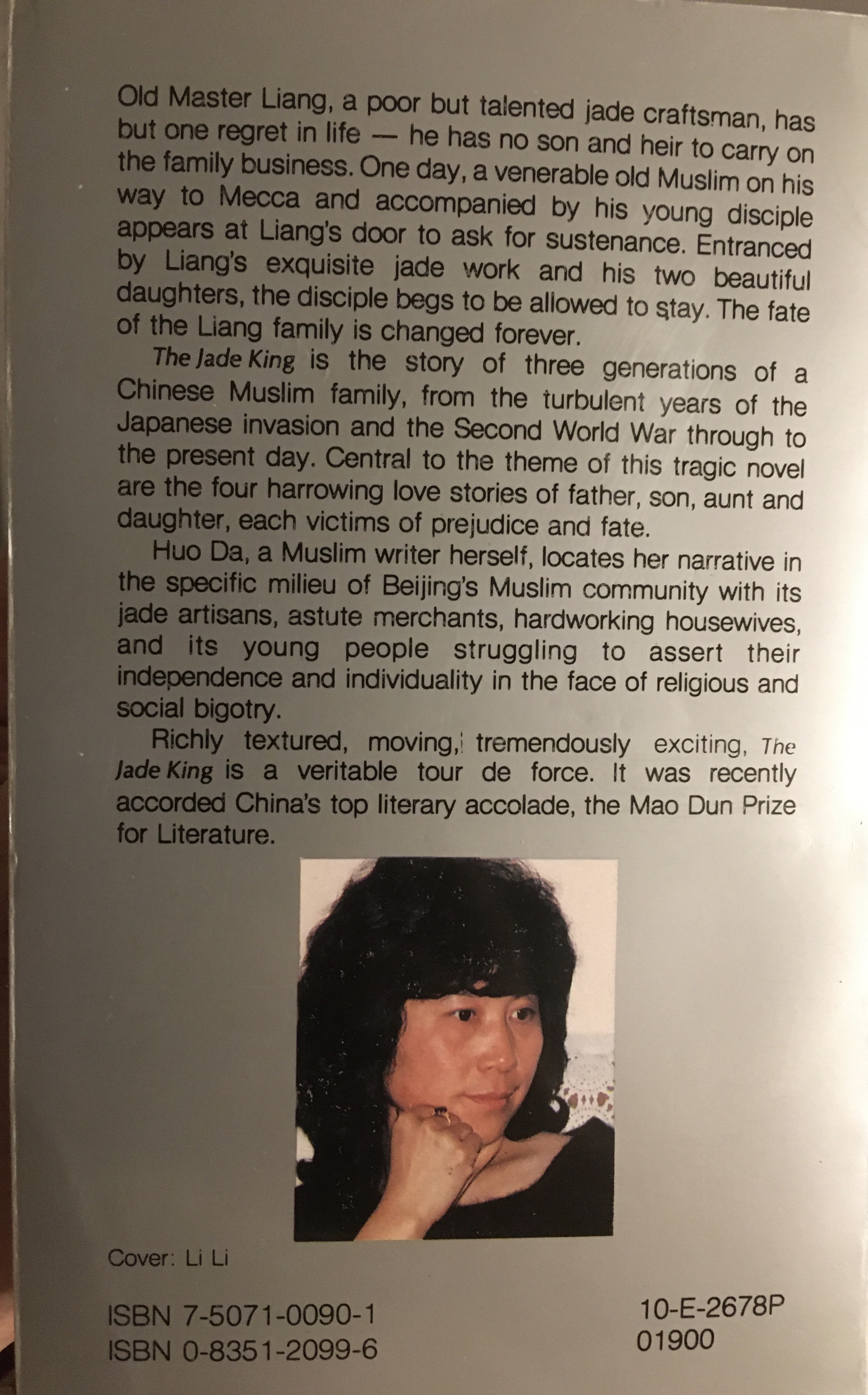 I finally got round to reading Huo Da’s ‘The Jade King’ or, in the original Chinese version ‘Funeral of a Muslim’ (穆斯林的葬礼). A best-selling and award-winning novel in China, and based in part on the author’s own experience, it tells the story of three generations of a Muslim family of jade carvers in the Muslim Quarter of Beijing. It charts a plot through the years of the period of the ‘Republic of China’, the Japanese invasion, World War II, and to a lesser extent the Cultural Revolution’s purging of long-standing sacredness. Portions of the tale are set in different time periods which weave together the full story. I didn’t expect to be hooked from the start and I haven’t been so moved by a book for a long time.