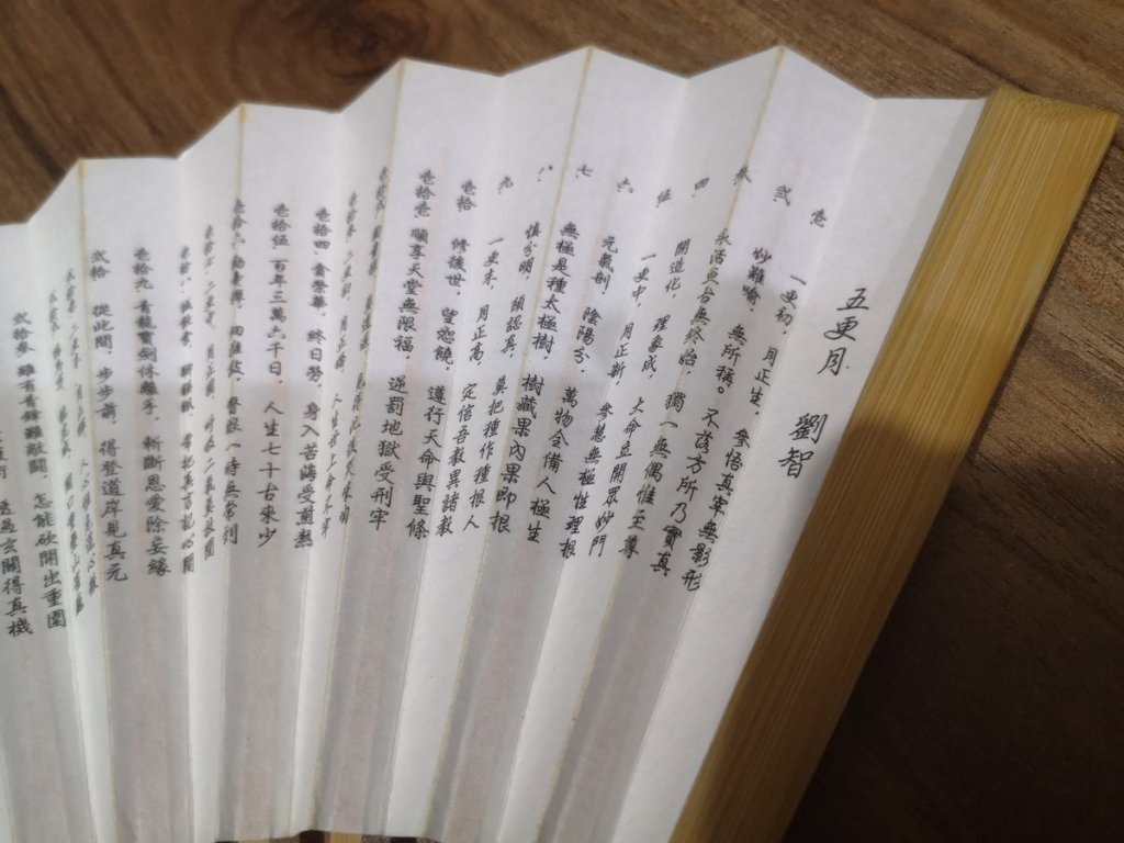 Upon this fan is inscribed the poem 五更月 [five sessions of the moon] by 劉智/刘智 [Liú Zhì]. It is a poem which outlines the doctrines of Islam and the spiritual path (道 dao) to enlightenment (ḥaqīqa) with a structure and imagery that reflects a careful use of Daoist poetry and Buddhist narratives.