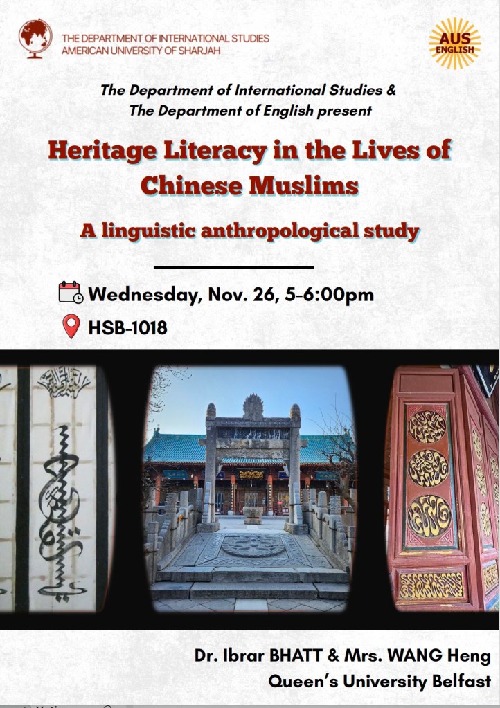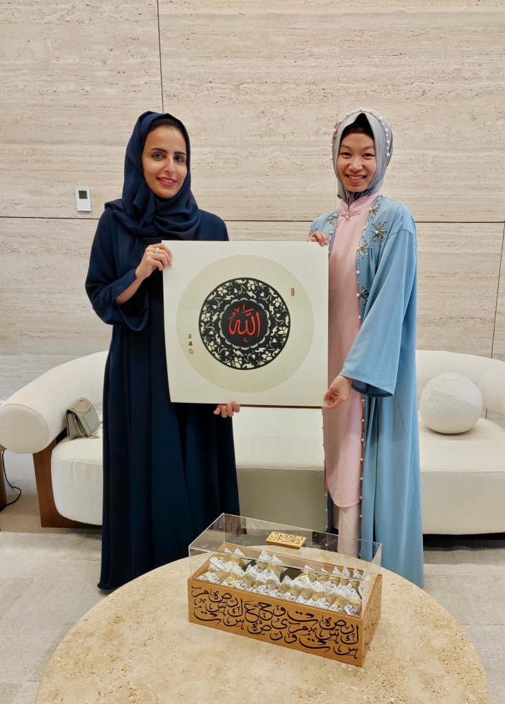 From Jeddah, we travelled to Sharjah (UAE), where we presented our work at the American University of Sharjah to an engaged interdisciplinary audience, followed by lively discussion with colleagues from history, archaeology, sociology, and literary studies. The final leg of the trip took us to Qatar, where we delivered further talks hosted by the Department of English Literature & Linguistics at Qatar University and met with colleagues and students. While in Doha, Heng Wang donated two pieces of Chinese Islamic artwork to the Al Mujadilah Centre, a women’s sacred and intellectual space. These pieces are unique calligraphy and paper-cut pieces connected to our Leverhulme-funded research.